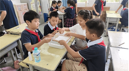 实践团成员首先参观矿区第一小学的校园与北理文化园,深入了解该校发展历程与育人特色后,随即开展“讲好延安故事,奏响红色文艺”主题宣讲,通过故事讲述、沉浸体验与科技实践结合的创新形式,带领小学生了解华寿俊造纸、陈康白制盐等延安创业故事,并动手体验“马兰草纸”制作。同时,大学生与小学生同台歌舞、朗诵,以文艺展演加强互动。此外,双方还共同学习非遗舞蹈拉花,从历史渊源到动作演绎,沉浸式感受传统艺术魅力。