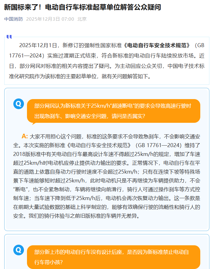 对于舆论追问,有关部门也做出回应。12月3日,微信公众号“中国消防”发布《电动自行车标准起草单位解答公众疑问》,电动自行车新国标主要起草单位中国电子技术标准化研究院表示“25km/h超速断电不会导致急刹车影响交通安全”“新标准充分考虑了搭载儿童的使用场景,消费者可在后座等位置安装儿童安全座椅”,网传“金属鞍座”只是极个别案例,并称“新标准禁止电动自行车安装后视镜”“新标准实施导致电动自行车门店大面积关闭”等消息不属实。人民网、《新京报》等媒体纷纷转载,澄清新标准的误解和传言。